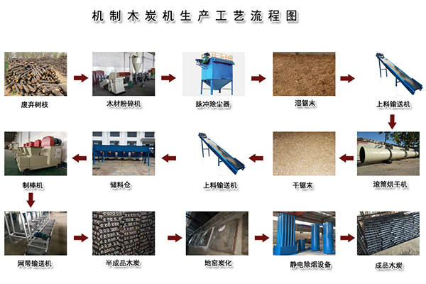 機(jī)制木炭生產(chǎn)工藝:原料——粉碎——烘干——成型——炭化——成品——裝箱——銷售 ??????????